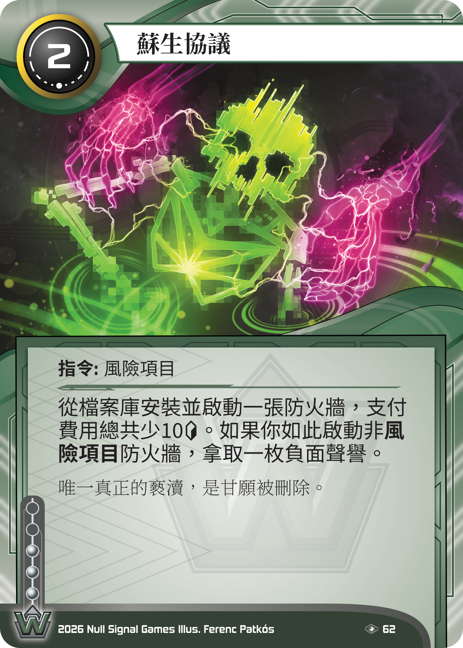 I like my translation of Reanimation Protocol. When I was coming up with the card’s name, a card from another game immediately came to mind: Monster Reborn from Yu-Gi-Oh!. It’s a spell that brings a monster back onto the field, which is pretty much exactly what Reanimation Protocol does, bringing ICE back in defense position.