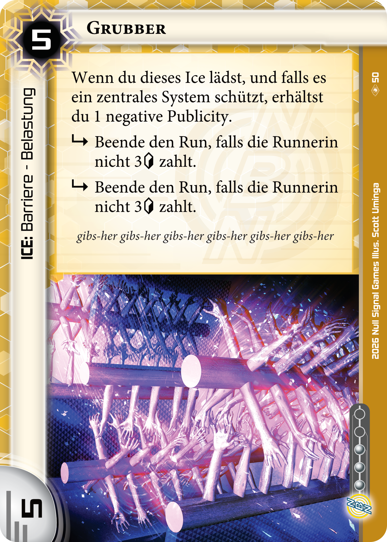In this case, I was not familiar with the term “Grubber” (a specific type of combine harvester) before. At the same time, I love the interplay of rules, flavor text, and artwork to illustrate the mixture of agricultural machinery and a virtual glutton that wants to grab the Runner’s money.